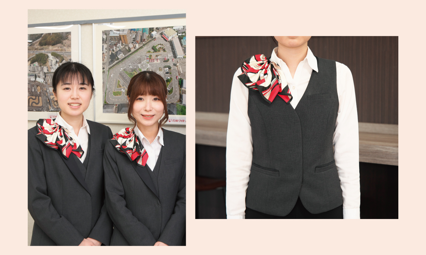 Aレディースジャケットの片襟デザインが新鮮で、以前と違う印象を楽しむことができています。スカーフも専用のループが付いているので付けるのがとても楽になりました!今までは結ぶタイプで時間がかかったり、人によっては仕上がりに差が出たりしましたが、今ではループに通すだけなので誰でも綺麗に簡単に着用できるのが嬉しいです。着心地も快適で、肩まわりが軽く窮屈さがなく、シワが付きにくい点も気に入っています。さらにペンを収納できるポケットも便利で、業務中のちょっとした作業もスムーズになりとても満足しています。